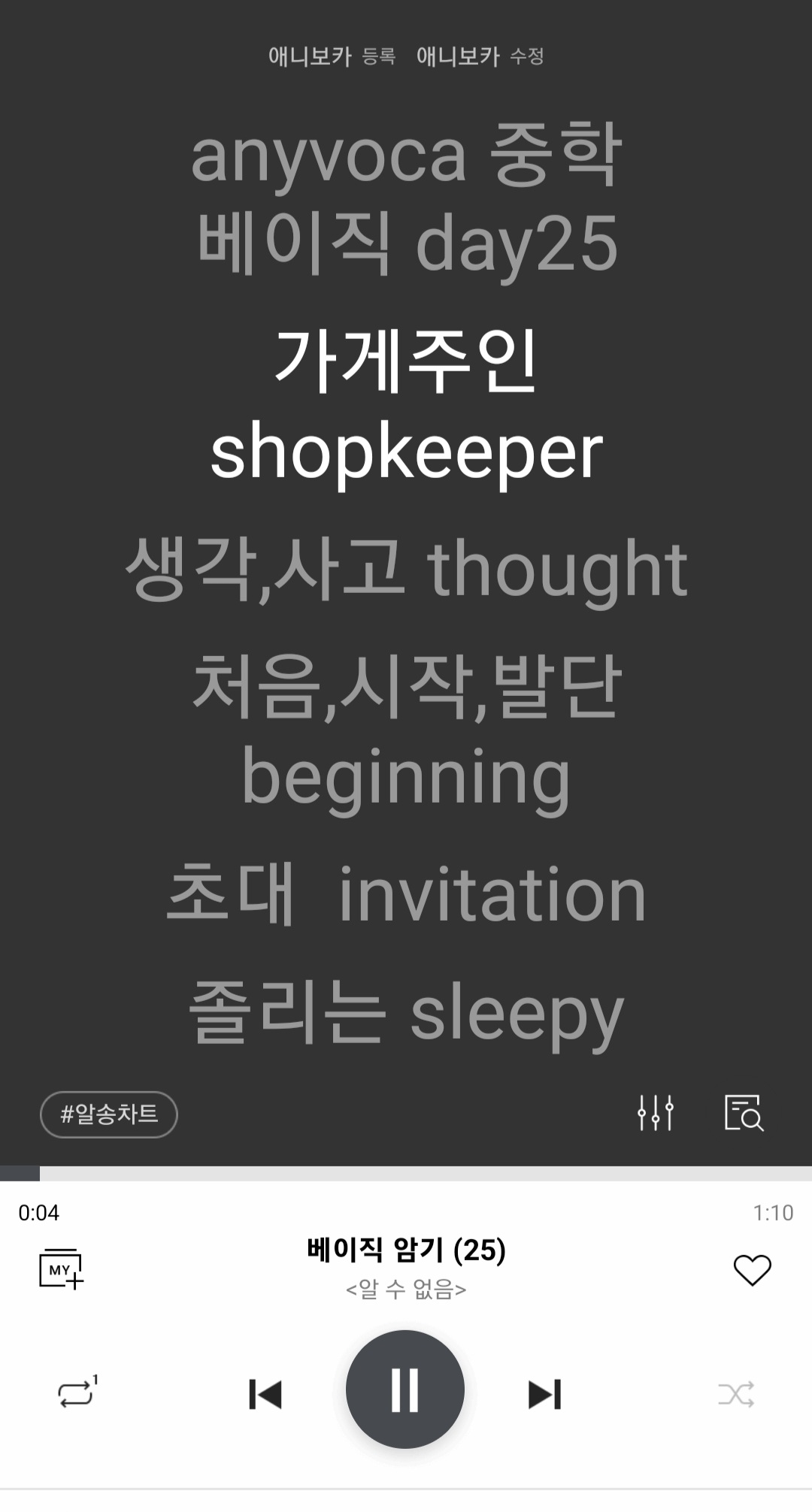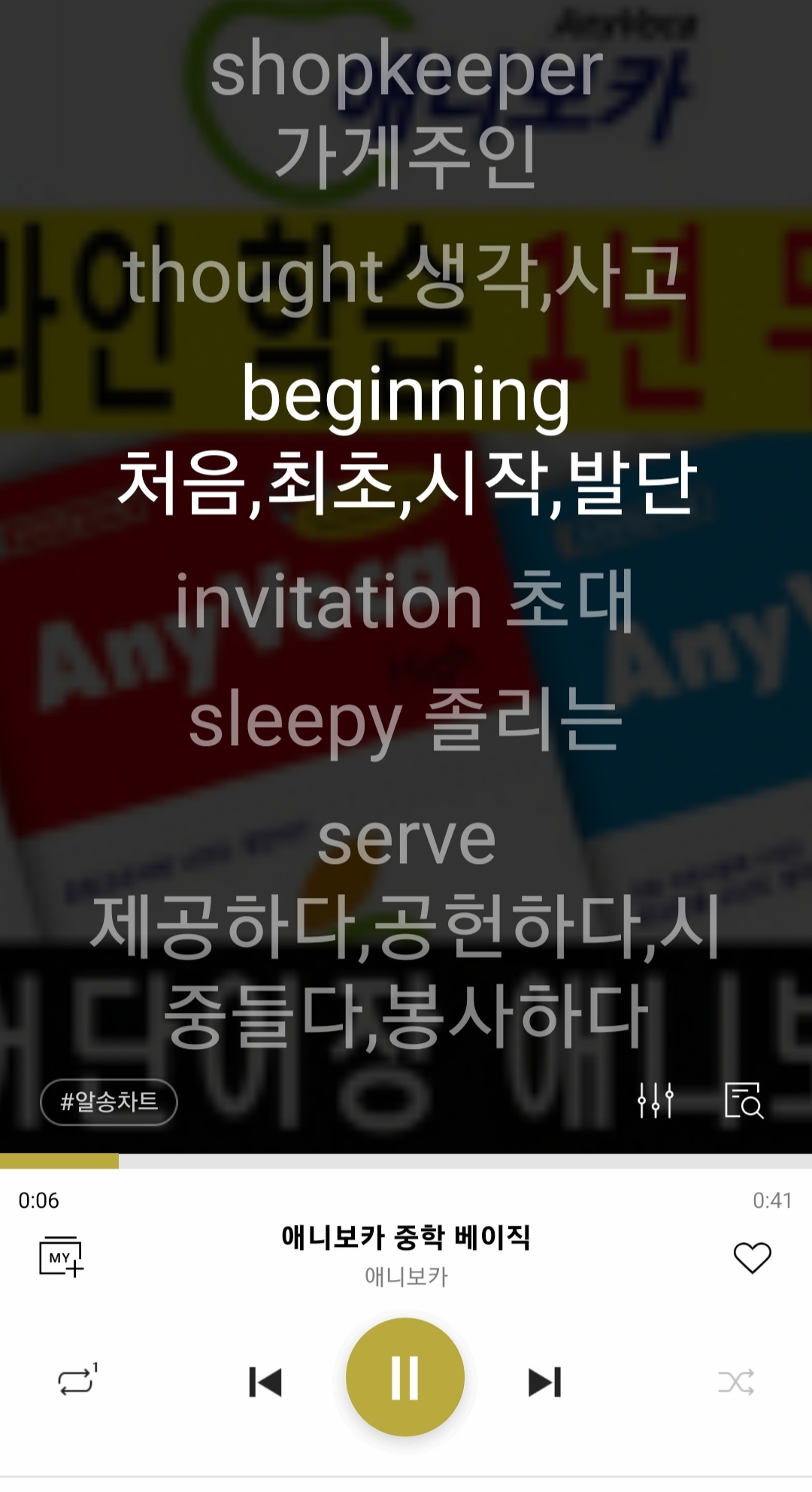 애니보카 mp3파일을 알송앱으로 재생하면 여러분의 휴대폰은 고급 어학기가 됩니다.